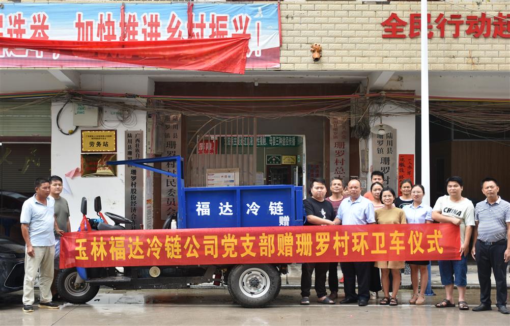 玉林福达冷链党支部向珊罗村捐赠环卫车一辆