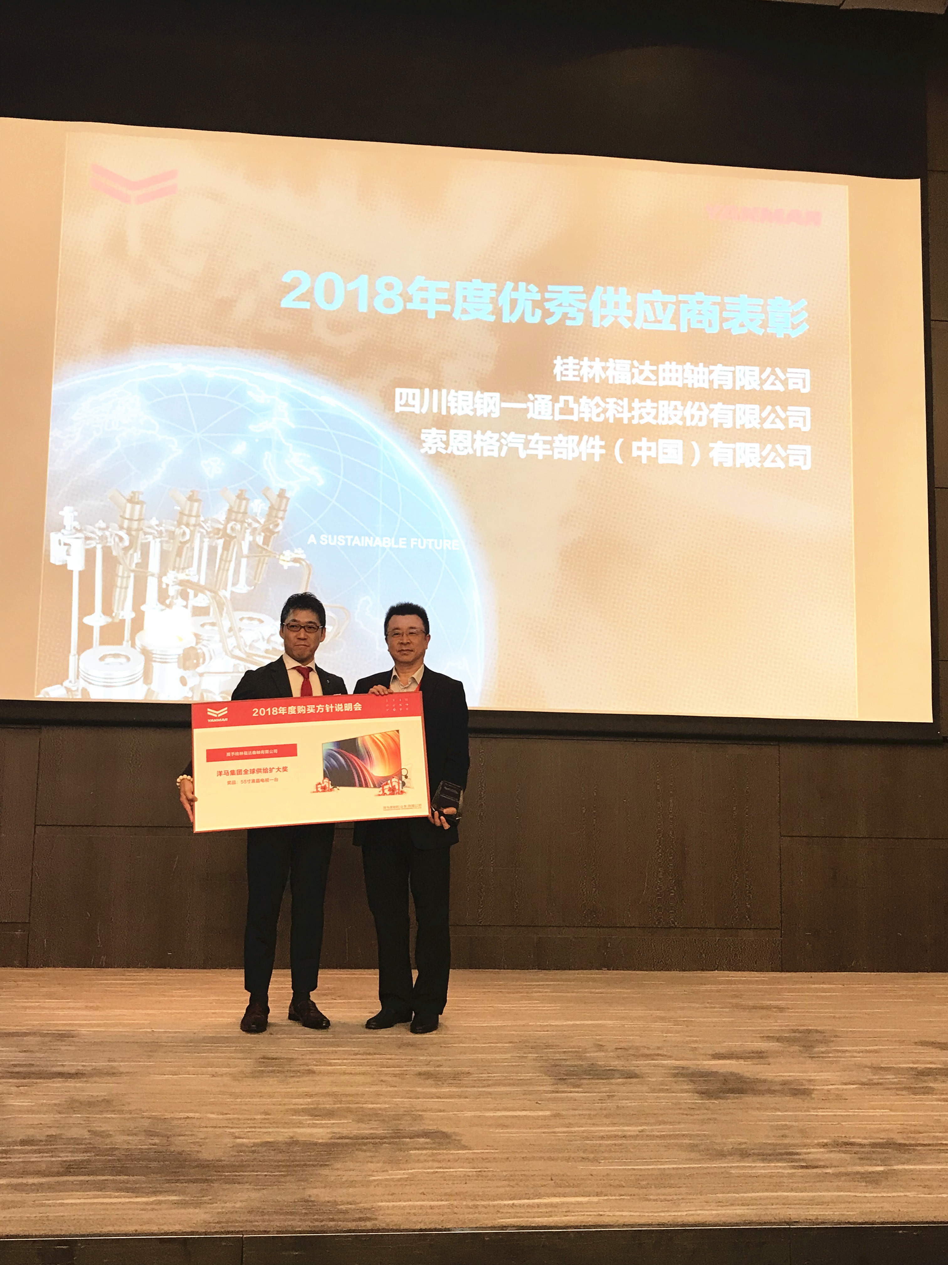 日前,洋马发动机(山东)有限公司举行了2018年度购买方针说明会。会上,桂林福达曲轴有限公司获得了“洋马集团全球供给扩大奖”殊荣。