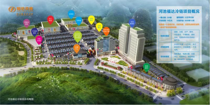 河池福达农产品冷链物流园用地面积约220亩,总建筑面积约24万平方米,主要建设内容包括农产品批发交易区、城市配送加工区、物流仓储区、综合配套区以及五万吨冷库等功能区,项目总投资10亿元人民币,计划2020年底全部建成投入运营。