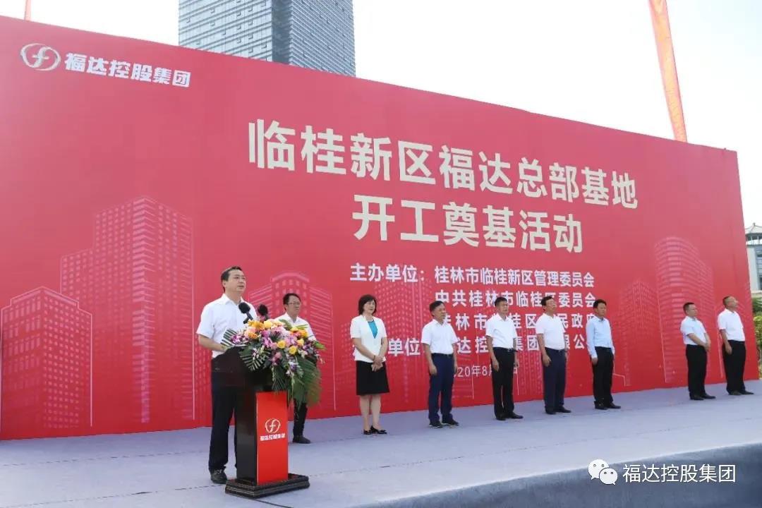 开工奠基活动上,桂林市委常委、常务副市长彭代元致辞表示,今天开工建设的福达总部基地项目,是一座集商务、办公、购物、酒店、总部经济等综合性功能为一体的综合大厦,也是目前桂林市规划建设中的第一高楼,标志着临桂新区的建设又迈上了一个新的台阶。项目建成后,将成为桂林城市的新地标、产业发展的新载体、城市开发的新亮点,对提升桂林城市价值,完善城市配套,促进产城互动、融合发展都将起到重要的促进作用。