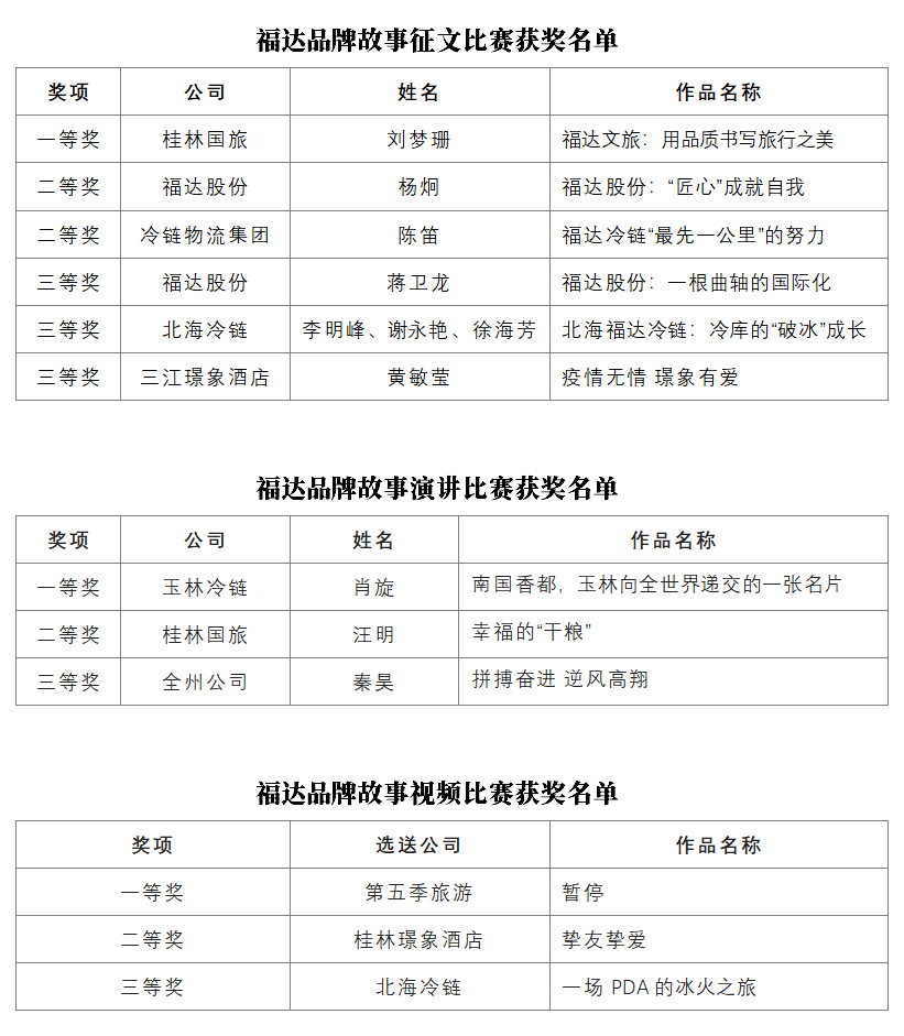 最后由福达学院院长连漪教授宣布了比赛结果。玉林冷链肖旋《南国香都,玉林向全世界递交的一张名片》获演讲比赛一等奖,桂林国旅刘梦珊《福达文旅:用品质书写旅行之美》获征文比赛一等奖,第五季旅游《暂停》获视频比赛一等奖。