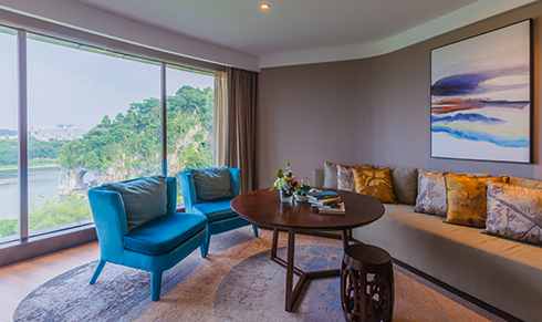 酒店占地面积约1000余平方米,楼高7层,客房总数99间(套),客房面积从33-85平米不等。对于客房的设计,灵活的规划空间,整片无框的玻璃飘窗借由窗外美景使房间更加的贴近自然。房间配色以大地色系为主,营造安心和舒适的氛围,简约的空间布局让室内显得宽敞通透。